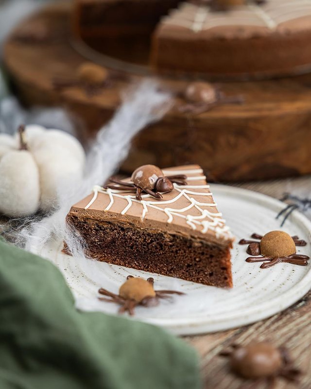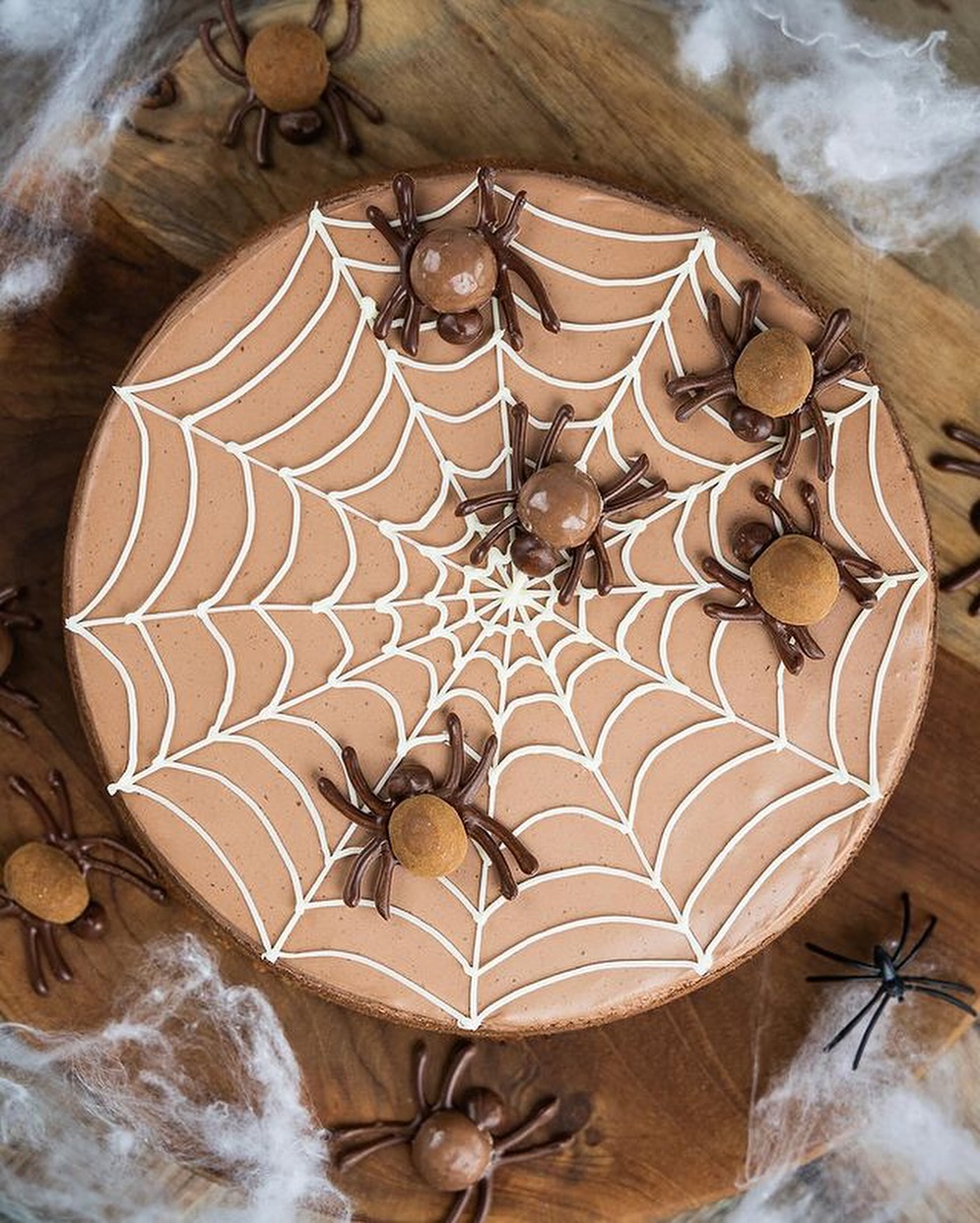 8. Koláček můžete strašidelně ozdobit. Autorka použila bílou čokoládu na pavučinku, tmavou čokoládu na hlavičku a nožičky pavoučků. Na tělíčka rozpůlila lískové oříšky v čokoládě.