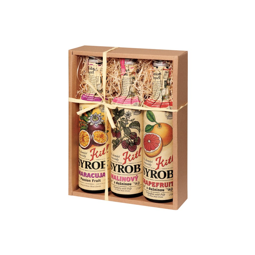 Dárkové balení ovocných sirupů Kitl. Obsahuje 3x 500 ml – Kitl Syrob Maracuja, Kitl Syrob Malinový a Kitl Syrob Grapefruit. Jedná se o naše nejoblíbenější sirupy pro osvěžující koktejly a domácí limonády.